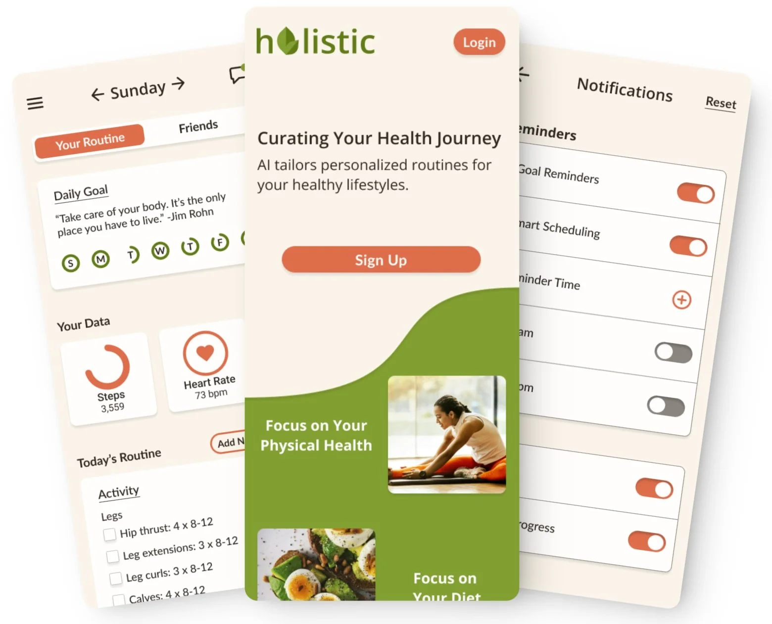 ‘Holistic’ is an AI-based health app that allows users to tailor workouts and other routines to their needs based on various aspects of their daily lives. Holistic aims to promote better health by making health more accessible and convenient.