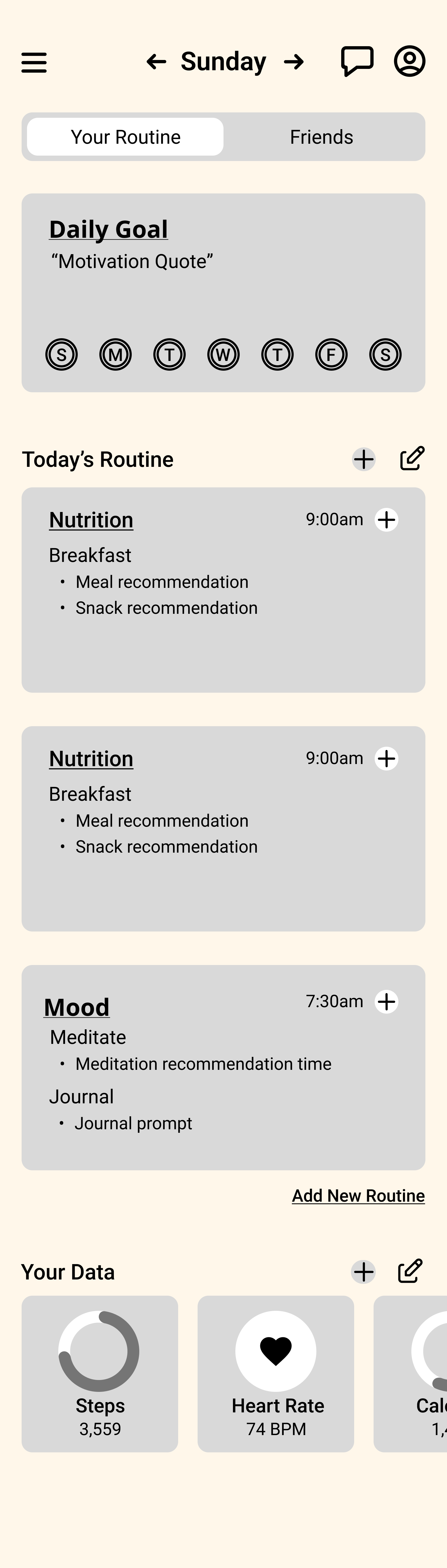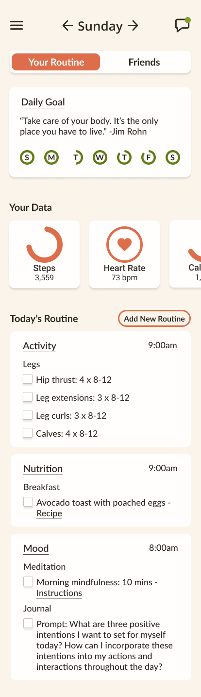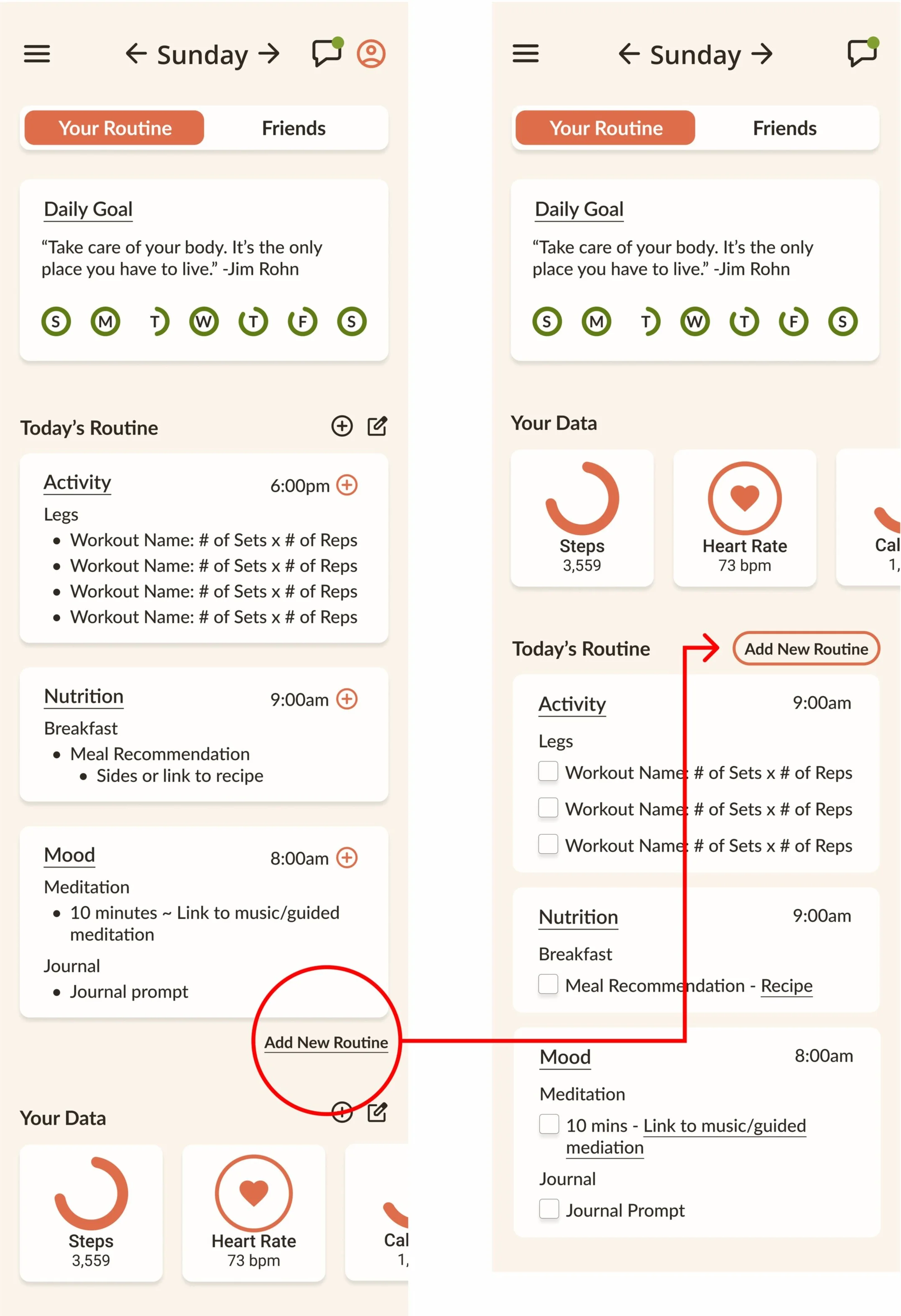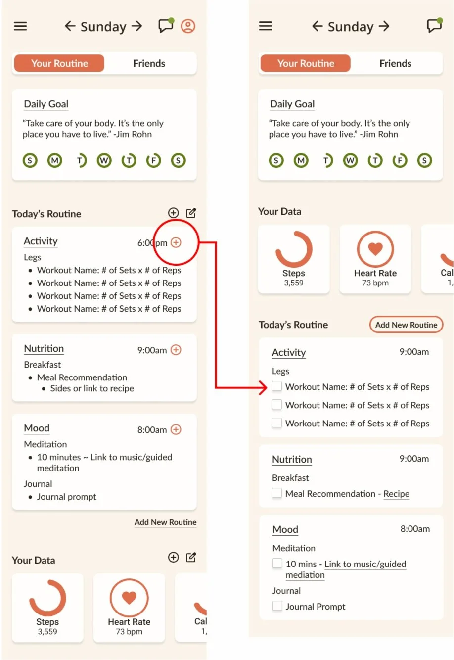 Based on feedback, I replaced the '+' icons with checkboxes, allowing users to mark tasks as complete within their daily routine.