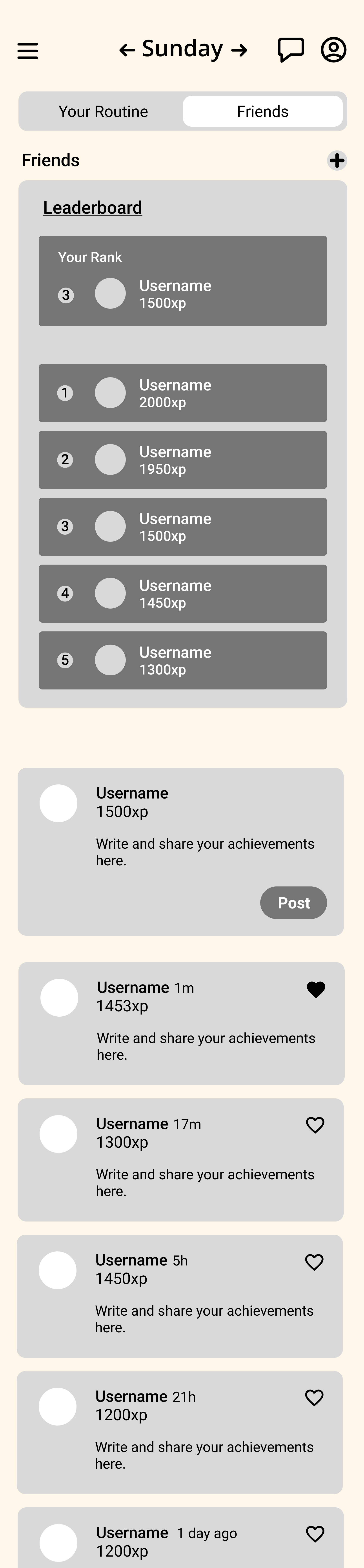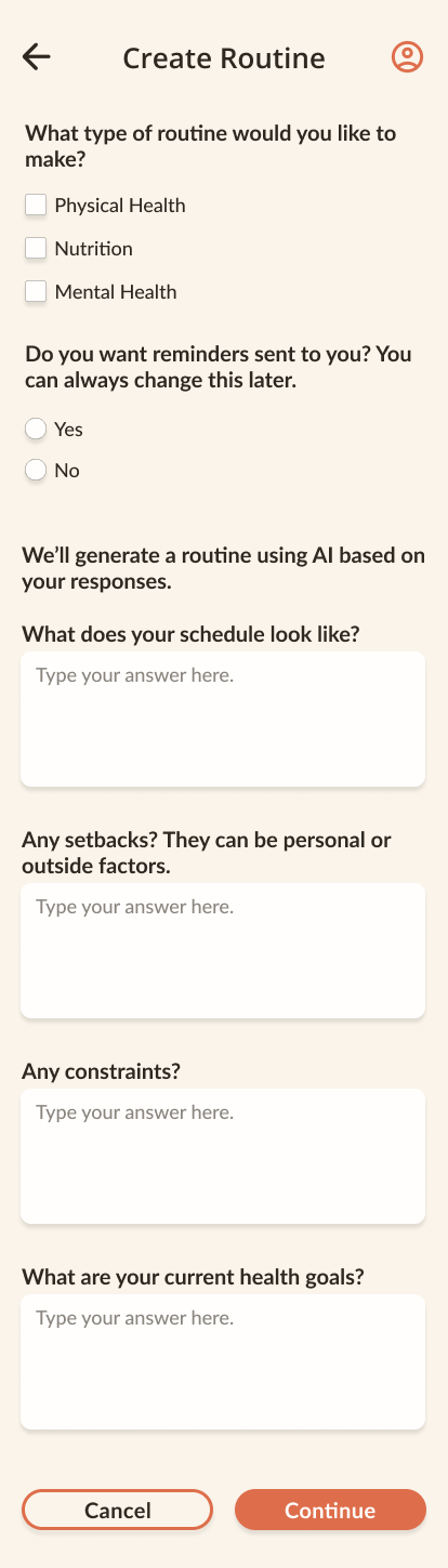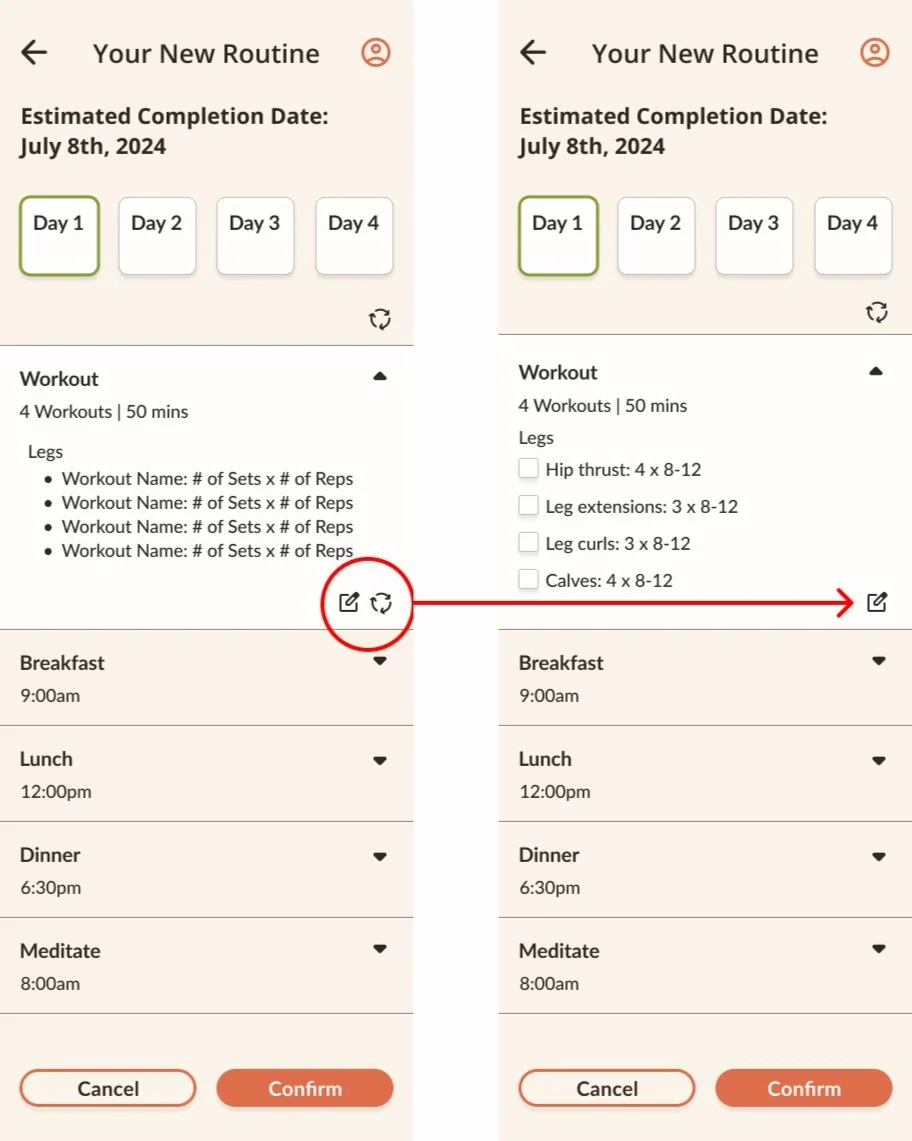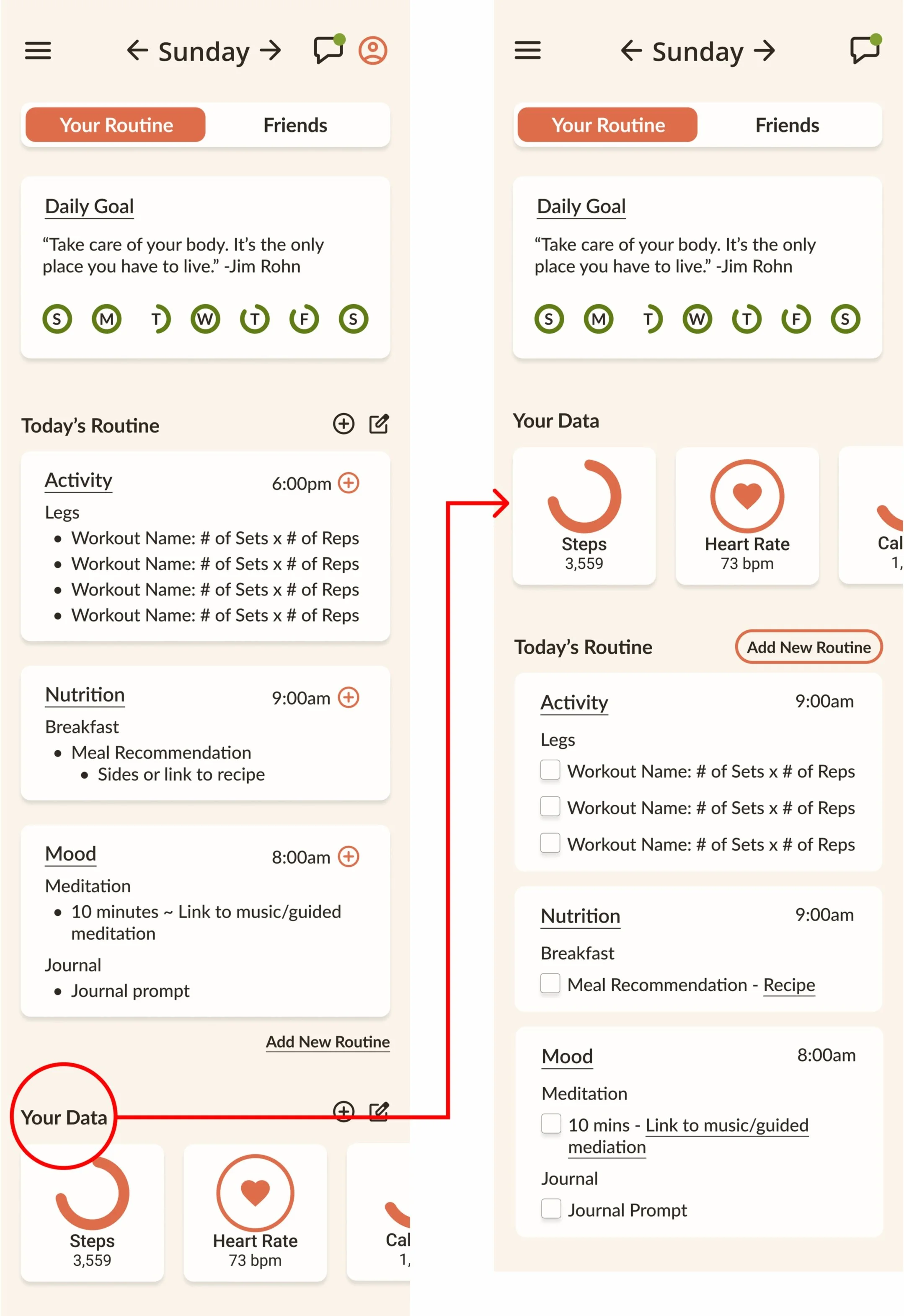 Based on feedback, I replaced the '+' icons with checkboxes, allowing users to mark tasks as complete within their daily routine.