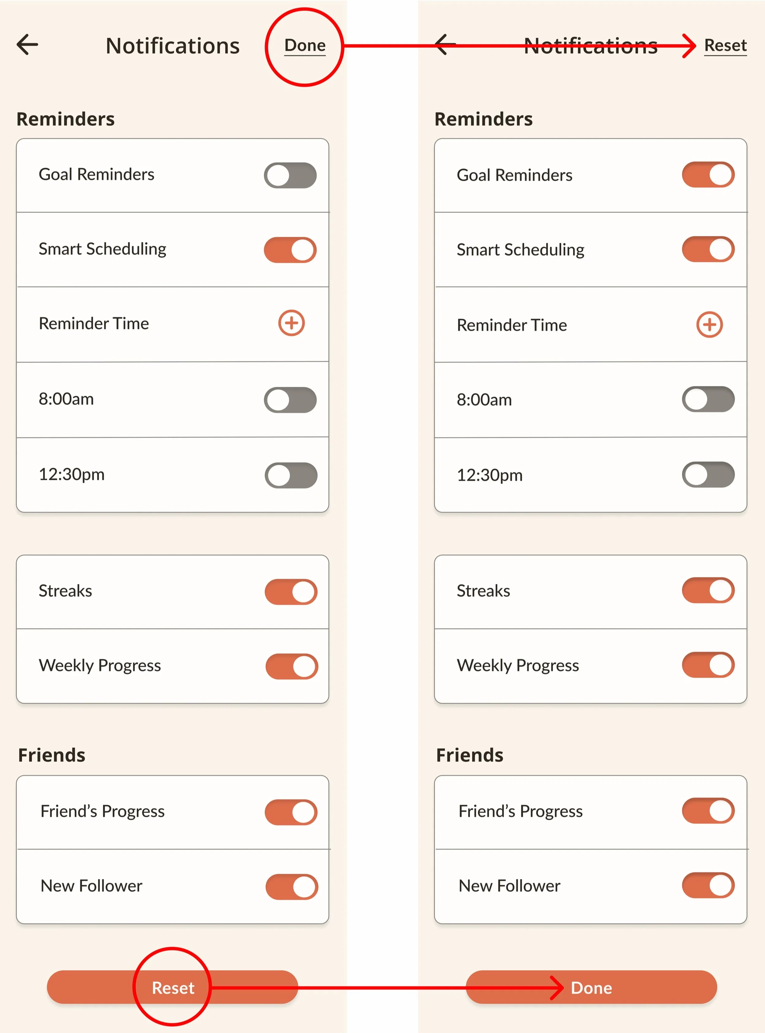 The 'Reset' CTA was swapped with the 'Done' CTA after users either accidentally clicked on 'Reset' or were inclined to do so because it was presented as the primary action.