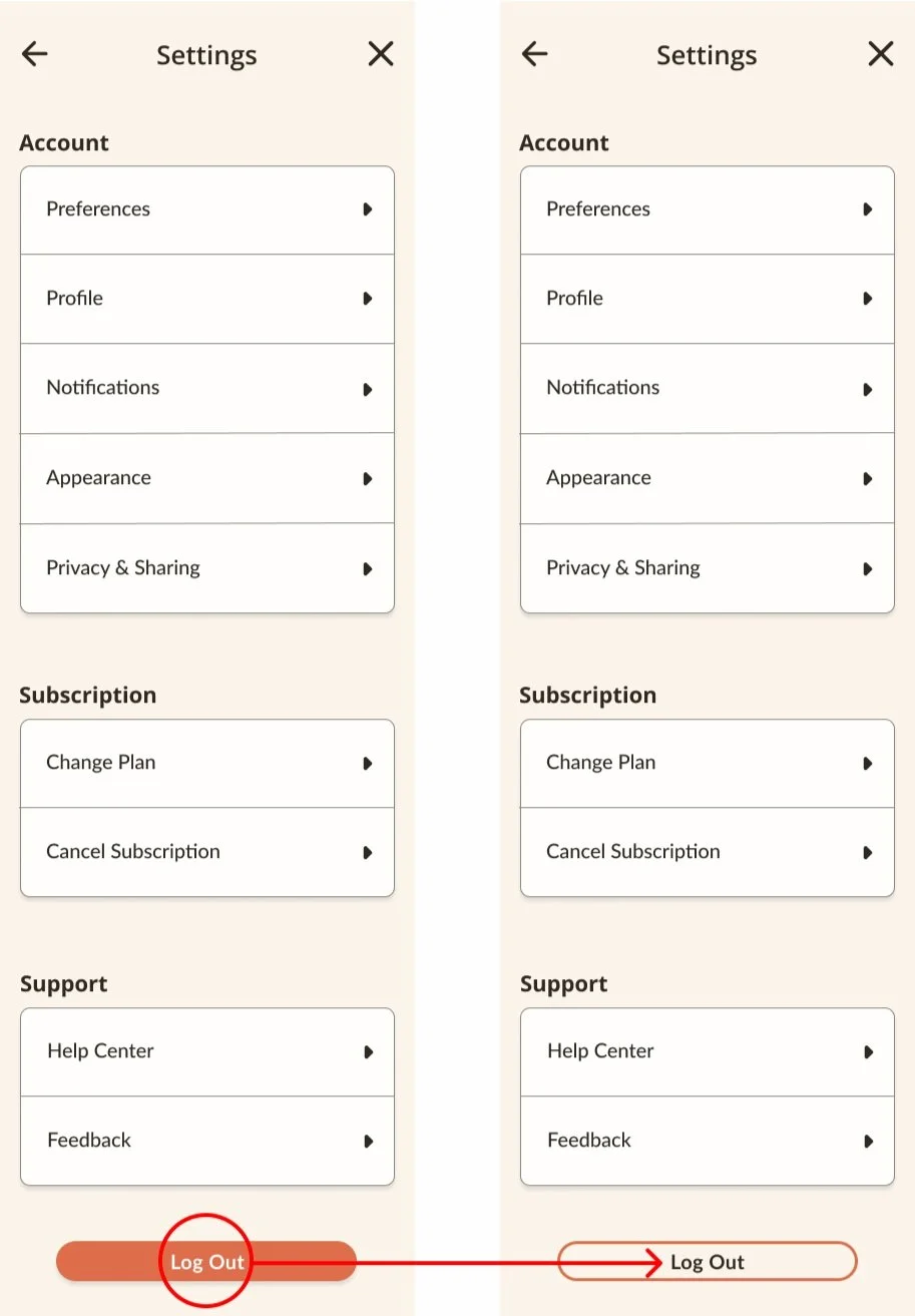 The 'Log Out' CTA was changed to a secondary action after users reported accidentally signing out. Making it a secondary CTA helps prevent this issue.