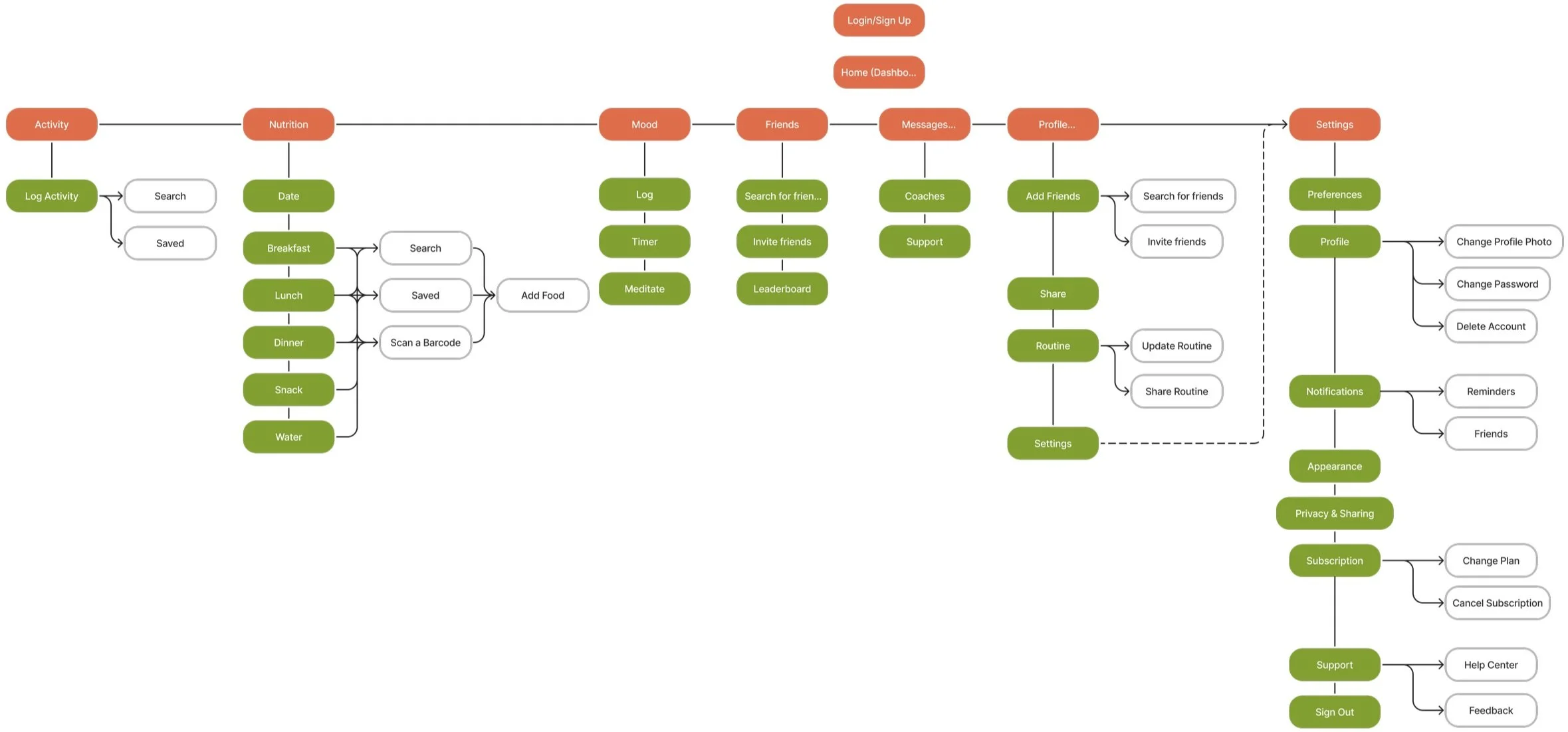 Based on user research, the app includes features such as personalized routines/plans, a resource hub, dedicated health pages (nutrition, fitness, journal, friends), and streaks to enhance user engagement.